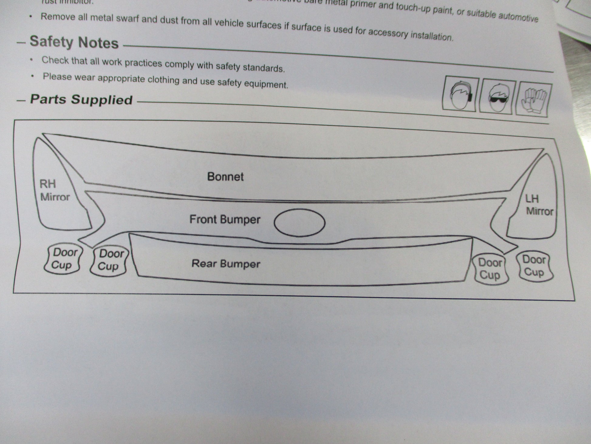 Includes front bumper, rear bumper, door cups & mirrors.
